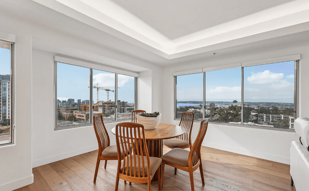 Wake up to sun-filled corner windows, coffee in hand, and Balboa Park just across the street. 3060 6th Avenue, Unit 7 is a rare corner residence offering park views, distant mountains, and sweeping glimpses of North San Diego Bay, Point Loma and the California Tower. Fully remodeled in late 2019, this light-filled home features an open floor plan, large windows throughout, and two standing balconies ideal for everyday living and entertaining. Engineered Provenza wood flooring, quartz countertops, and custom Leicht kitchen and entry cabinetry create a clean, modern aesthetic. The designer kitchen includes integrated Miele appliances, induction cooktop, steam oven, dishwasher, and a cabinet-depth Sub-Zero refrigerator and freezer, creating a seamless built-in look. A fully outward extending Lazy Susan and pop-up electrical outlets add thoughtful functionality. A lit tray recessed ceiling enhances the main living space. The expansive primary suite offers a walk-in closet and spa-inspired bath with a freestanding soaking tub. Additional highlights include a second bedroom/office, full second bath, LG washer/dryer, Nest thermostat, heat pump heating and cooling, two garage parking spaces, and a private storage locker. Building amenities include an elegant lobby with kitchenette and bathroom. Hot water and trash are included In HOA. Offered at $1,065,000, this well-cared-for home delivers rare views, light, and an irreplaceable location directly across from Balboa Park. Minutes from San Diego Zoo, world-class museums and an endless array of dining, shopping entertainment and cultural experiences. Perfect for the design-forward urban sophisticate, the Balboa Park devotee, the entertainer (without the chaos), and the calm luxury seeker.